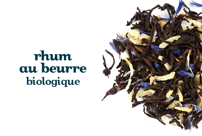 Encore un thé noir. Et oui, je suis bien malgré moi une adepte de ces délicieux thés! Rhum au beurre biologique ne goûte pas le beurre, ni le rhum, mais bien la noix de coco et la vanille! Il est très crémeux, ce fut un énorme coup de coeur dès la première gorgée pour moi! Moi qui ne suis pas particulièrement friande de vanille, cette fois, j’ai baissé ma garde juste assez longtemps pour pouvoir découvrir ce thé tout droit sorti des tropiques!