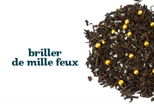 Capture d’écran 2014-02-16 à 17.33.13Briller de mille feux est un autre thé chaï comme on les aime! Débordant de cannelle, il contient des cristaux de sucre qui se décomposent en milliers de petites paillettes d’or et d’argent qui feront scintiller votre tasse de thé! Et il brillera véritablement de mille feux… On vous avait pas dit ça hein, mais c’est super glamour boire du thé! ;)