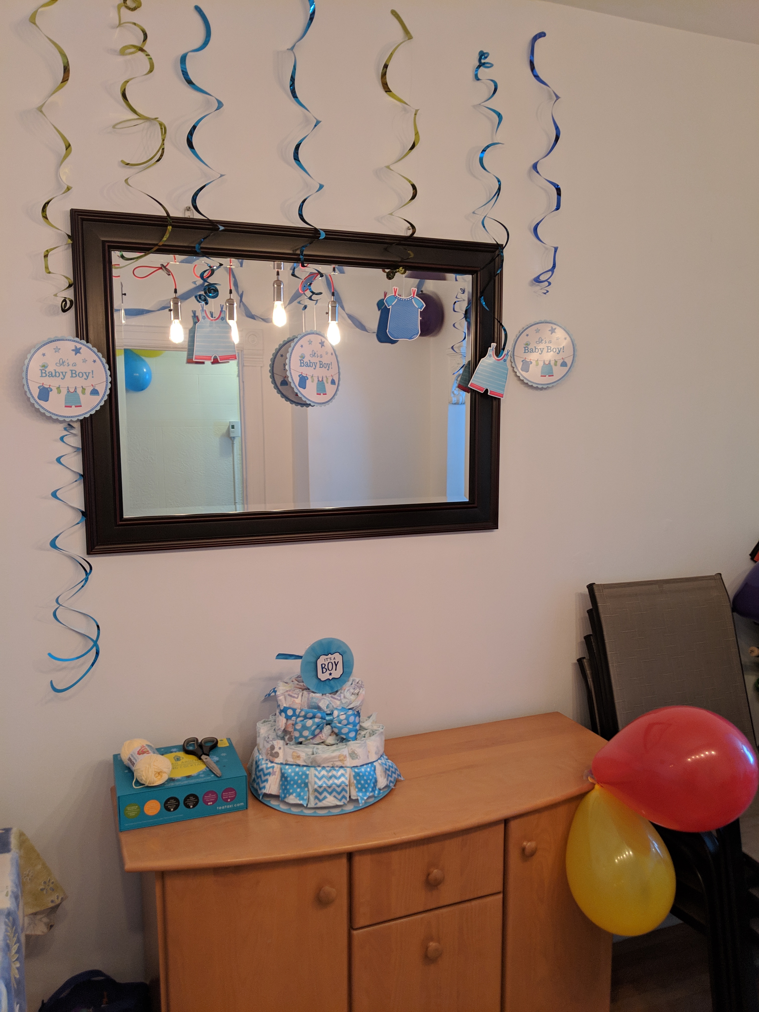 En regardant les idées de jeux, je n’ai pas été particulièrement enchantée. Je souhaitais un jeu rassembleur, qui ne prendrait pas trop de temps ni trop de préparation : ça se faisait plutôt rare, je dois avouer. Il y avait beaucoup de jeux qui n’impliquaient que les parents! J’ai finalement choisi le jeu de « Devine la grosseur de la bedaine! ». Ce jeu est tout simple : avec une balle de laine, on demande à chaque invité de couper la corde à la grandeur du tour de taille de future maman. Lorsque tout le monde a sa corde, on compare directement sur maman! La personne avec la corde la plus proche de la réalité gagne… dans ce cas-ci, j’avais apporté un ensemble de thé à faire tirer. Je me disais que tout le monde aimait le thé! Ça a fait fureur, et c’était vraiment drôle comme jeu!