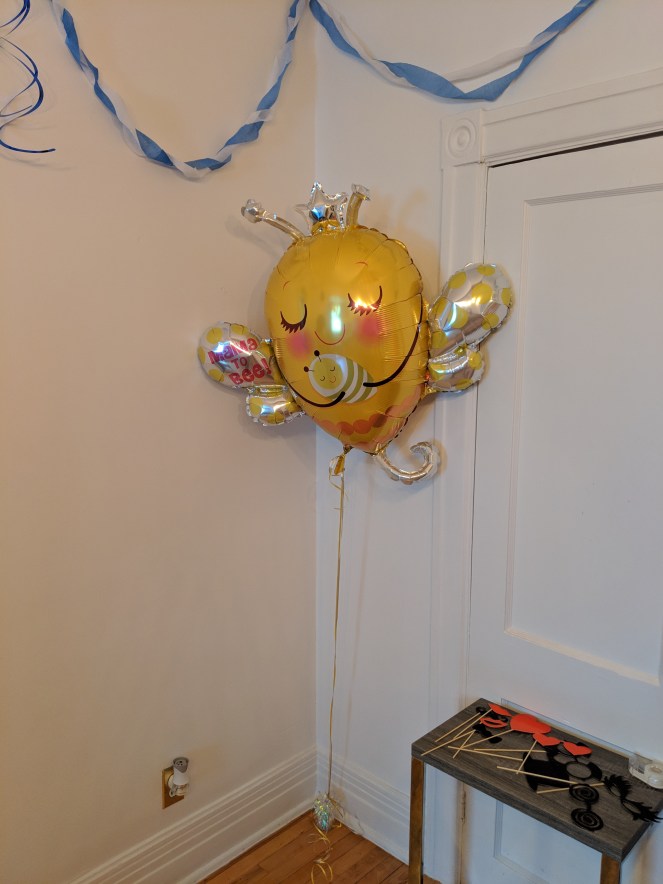 Évidemment, on a TOUT misé sur les décorations. L’ambiance d’une telle célébration est si importante! L’amie de ma soeur was a QUEEN à ce niveau-là! Comme c’est elle qui recevait, je suis allée l’aider le jour même pour tout mettre en place. De mon côté, pour ajouter ma petite touche, j’ai fais gonfler un ballon à l’hélium en forme d’abeille « Mama to Bee »… j’ai pas pu résister, c’était si cute!!! 😍😭 Je fais toujours gonfler mes ballons à l’hélium à mon Provigo… je ne sais pas s’ils sont tous comme ça, mais le mien a une super belle section pour les ballons à l’hélium! (pis c’est juuuuste à côté de leur section plantes 😍…. hum hum 😂)