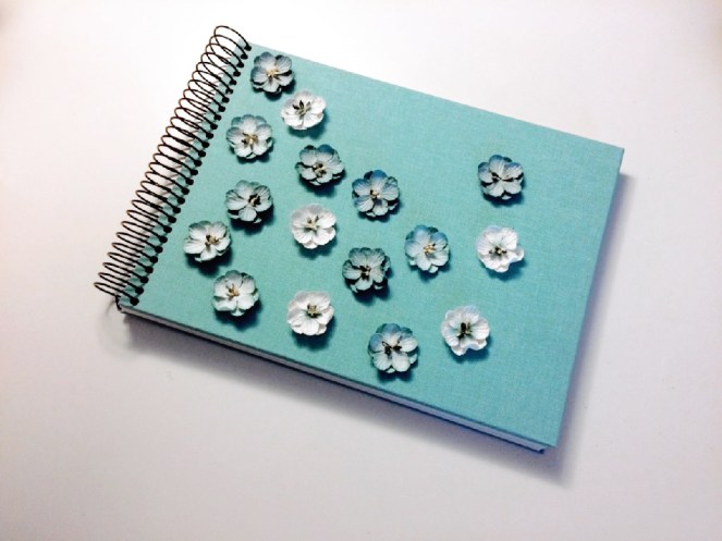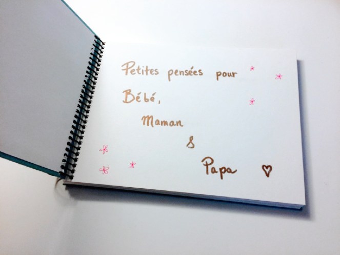 J’ai aussi préparé un reccueil de pensées pour bébé et les parents. J’ai cherché un peu chez DeSerres, et j’ai remarqué que les livres spécialement conçus pour les bébés étaient, ma foi, HORS DE PRIX! J’ai décidé d’opter pour un petit livre neutre, sur lequel j’ai collé de petites fleurs. 30$ à la place de 50… Mon porte-feuille me remercie! Hahaha! Malheureusement je crois que plusieurs personnes ont oublié d’y écrire un petit mot… Mais ça ne m’étonne pas, étant donné qu’on était une quinzaine de personnes, ça brassait pas mal!