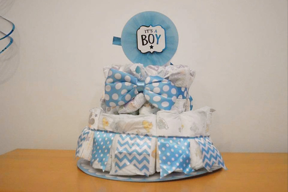 L’amie de ma soeur souhaitait en faire un peu plus mais j’étais réticente à l’idée. Elle parlait de gâteau de couches… j’avais aucune idée de quoi elle parlait hahaha! Je lui ai mentionné que je pensais qu’on en avait assez fait… finalement elle a acheté tout ce qu’il faut pour le faire quand même. Et quelle bonne idée c’était! J’ai trouvé que ça ajoutait vraiment LA touche parfaite qui criait « BABY SHOWER, HELLO!!! ». C’est super rapide à faire, mais ça prend plusieurs paires de mains pour tout tenir pendant sa fabrication… il faut être deux personnes minimalement, et même trois personnes ne seraient pas de trop!