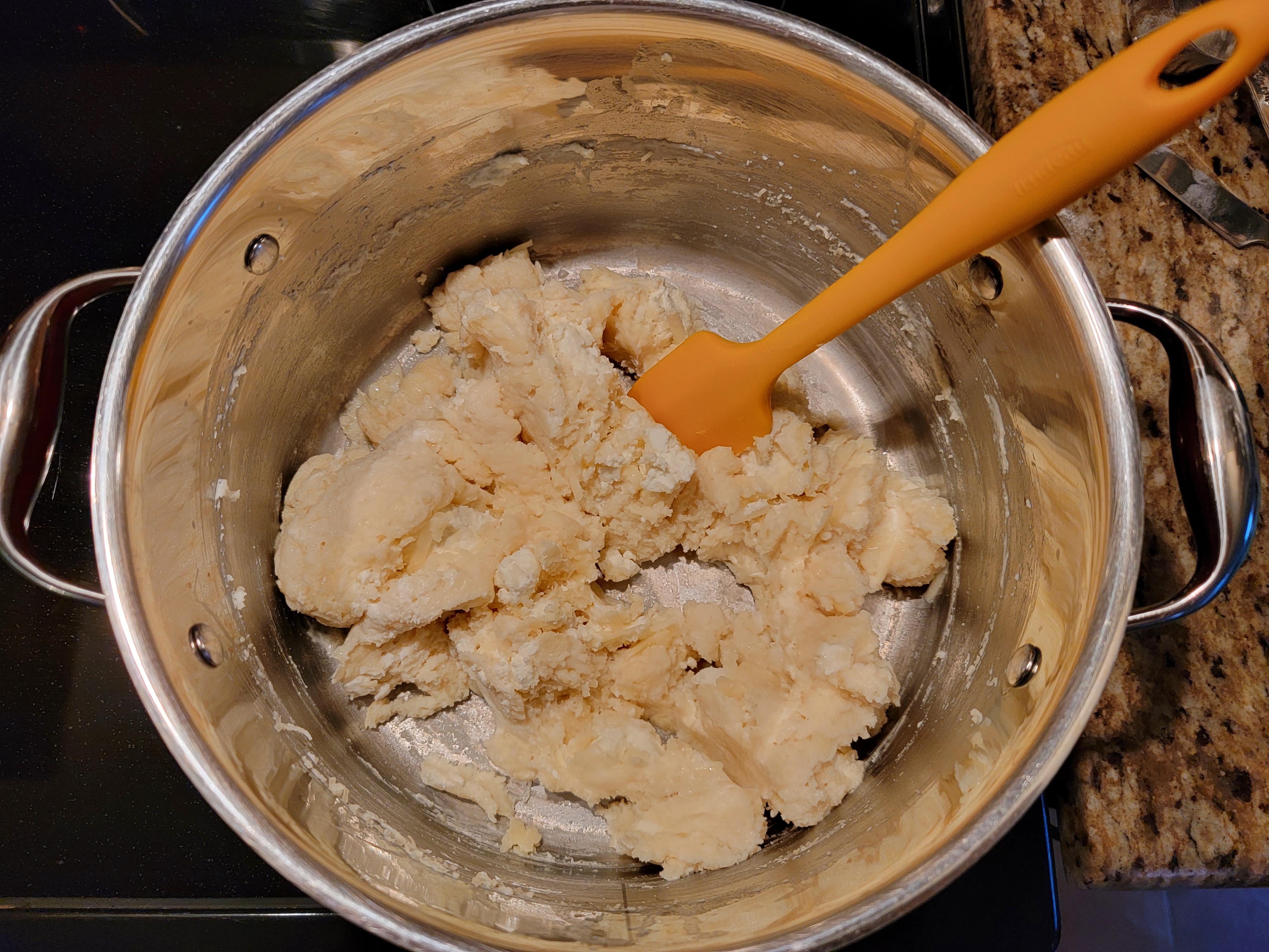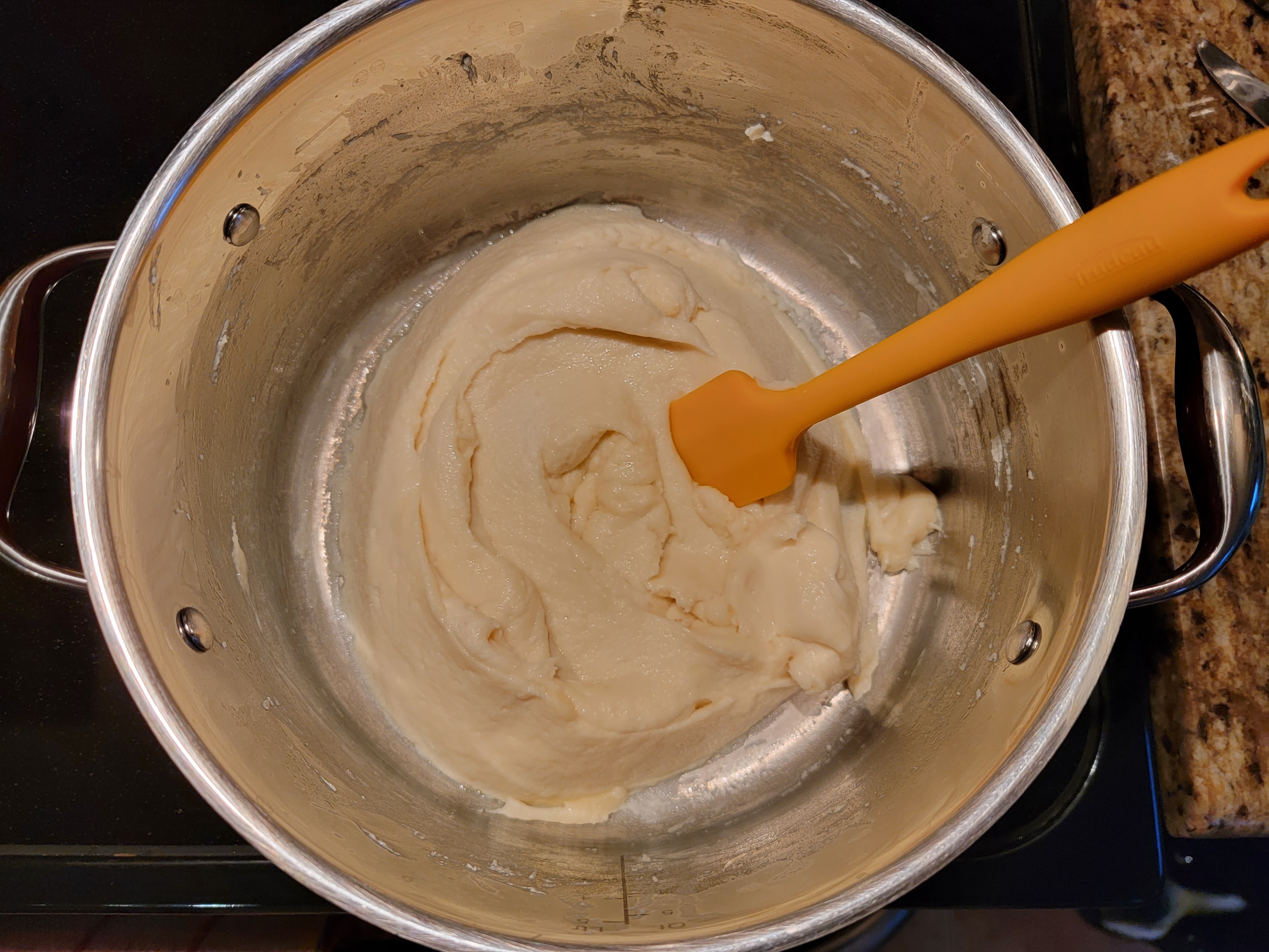 Ajouter le lait en fouettant jusqu’à l’obtention d’une texture ‘patates pilées’.
