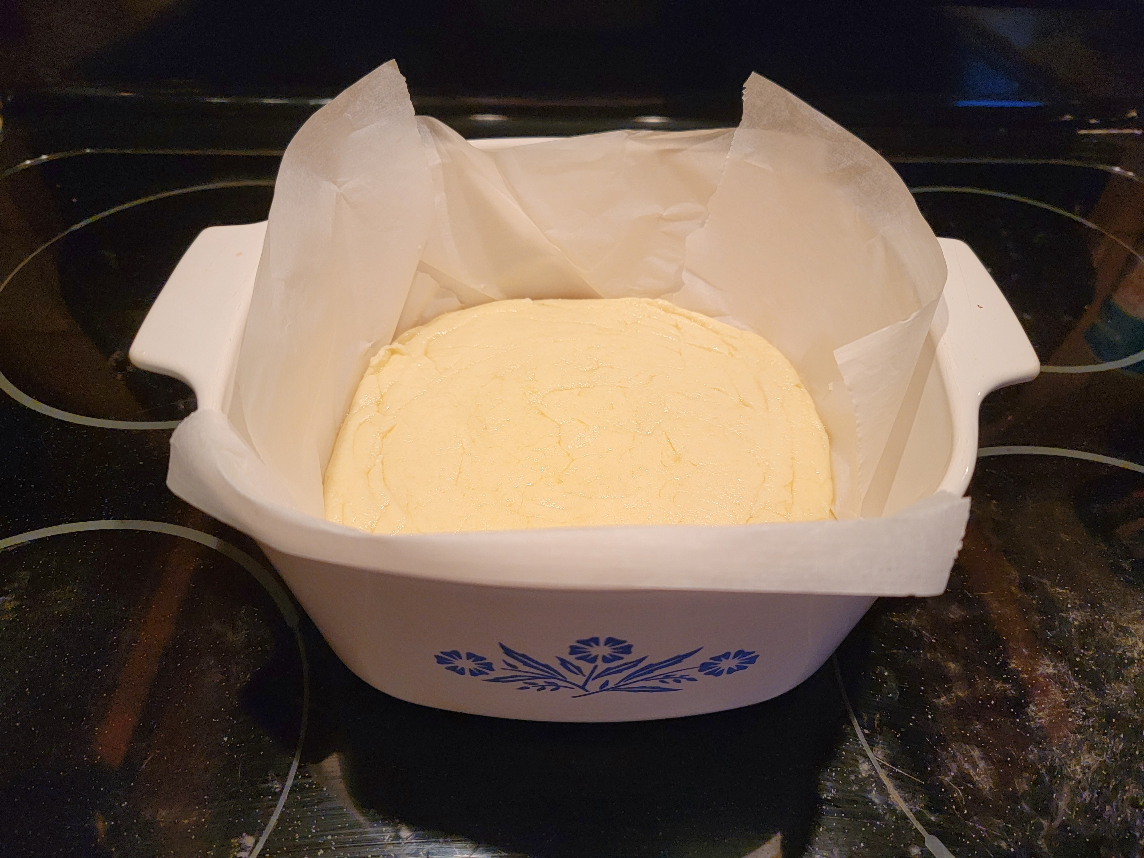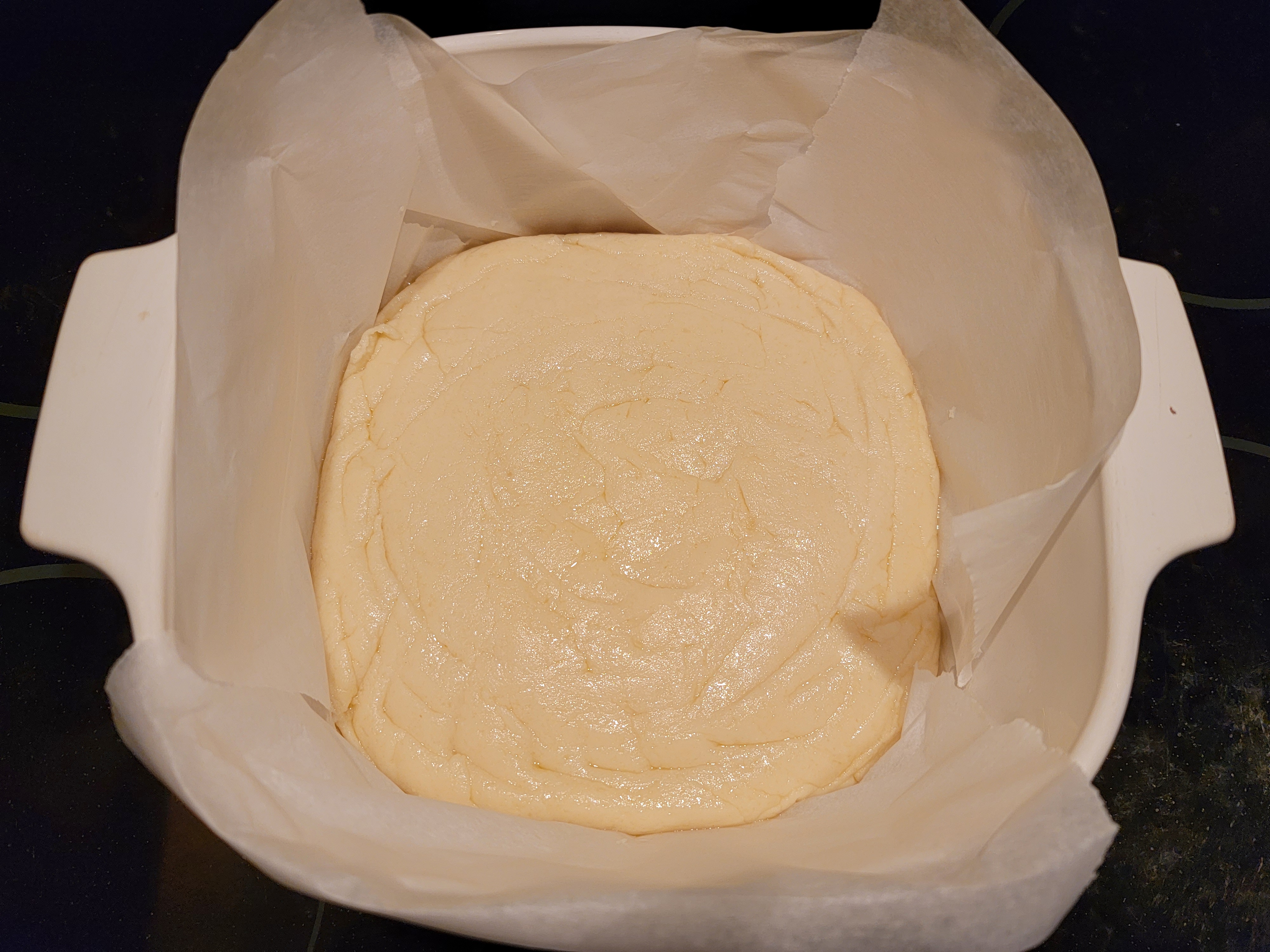 Recouvrir le fond d’un moule (ou plat de pyrex, c’est sans importance) de papier parchemin et y déposer la pâte fromagée. Écraser et égaliser, laisser tiédir puis envoyer au congélateur 2-3h.